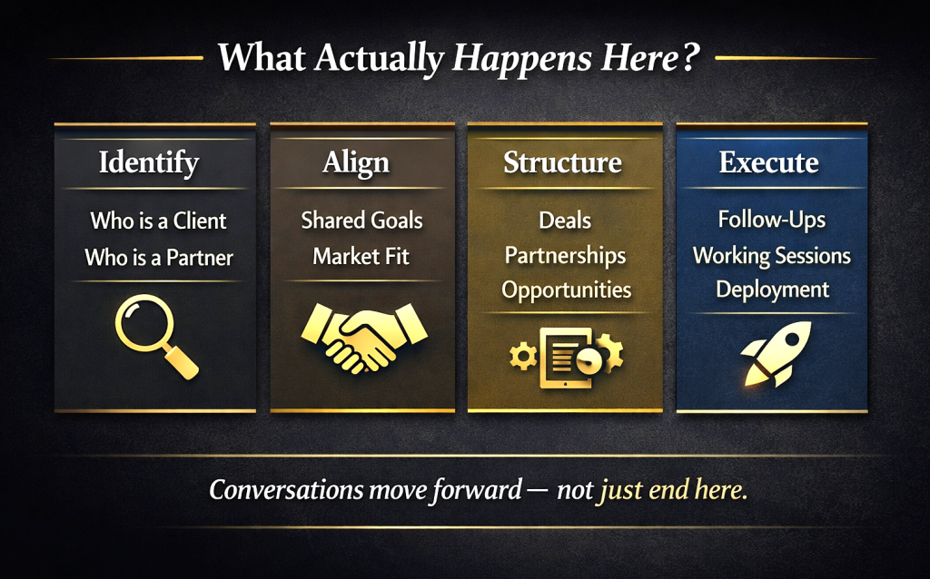 The experience brings together business leaders, capital partners, solution providers, ecosystem builders, and policy-aware groups to engage in structured dialogue, strategy sessions, and working conversations that reflect how decisions are actually made.