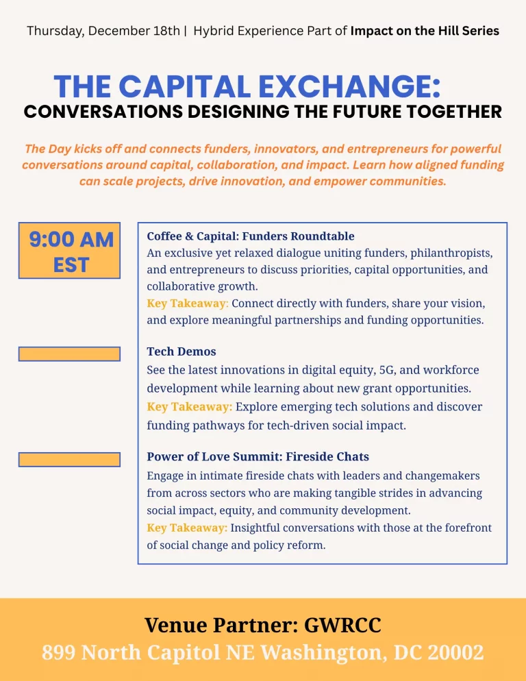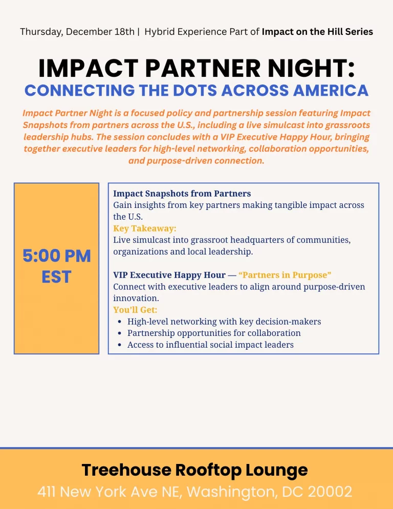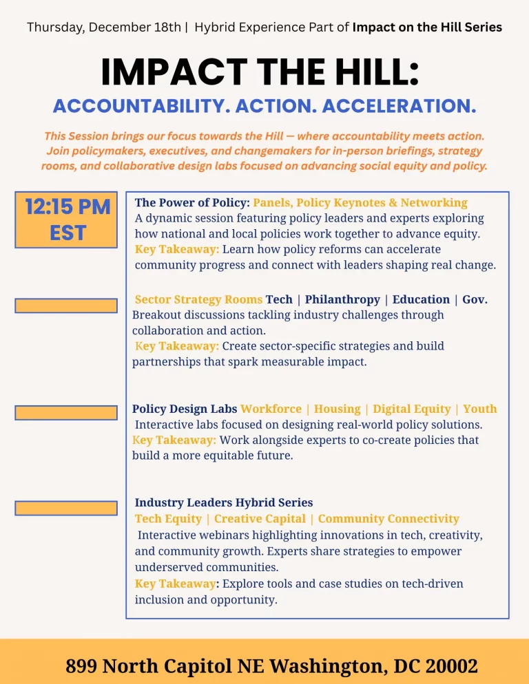 Impact on the Hill is a national initiative that aligns grassroots innovation with state/federal policy. We will bring community leaders, philanthropic changemakers, and industry experts to Capitol Hill for opportunities of civic alignment, network activation, and economic visioning.